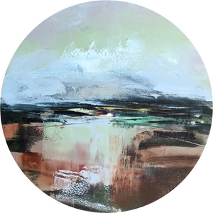 Through her experimental use of un-painterly tools and traditional paint, she creates both landscape of great tranquility and portraits of disturbing disquiet. Experimentation with mediums and tools is central to her practice and continued exploration of subject matter.