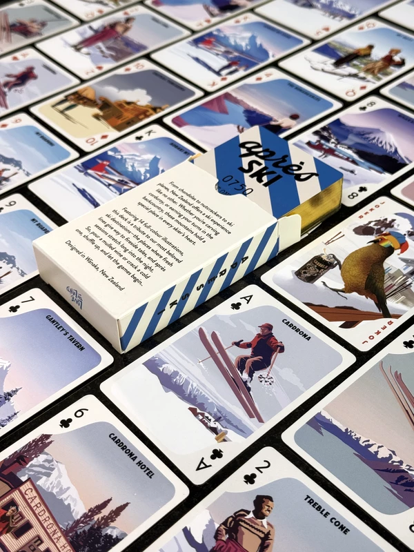 A premium art deck for mountain lovers. Featuring 14 unique skiing illustrations and luxe gold edging, these high-quality cards bring alpine charm to your après—perfect for fireside games, ski lodge vibes, or snowed-in nights. Cards include: Cardrona, Treble cone, The Remarkables, Mt Hutt, Mt Ruapehu Whakapapa, Mt Cook, Chateau Tongariro, Roundhill, Cardrona Hotel, Gantleys Tavern and Craigieburn.