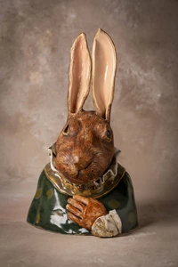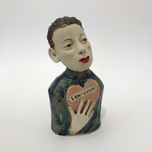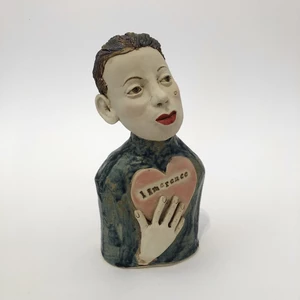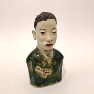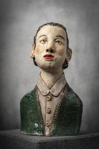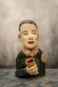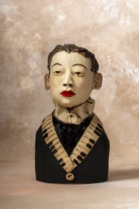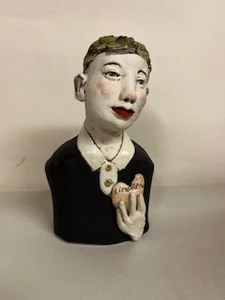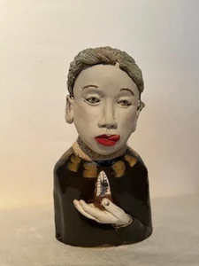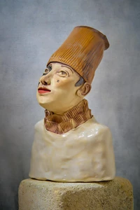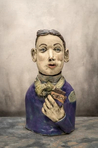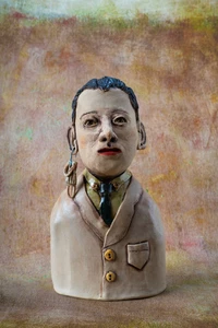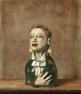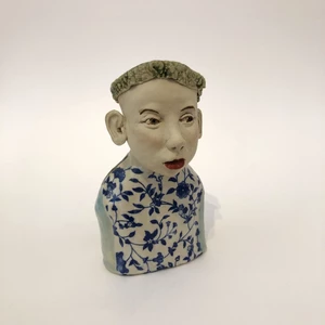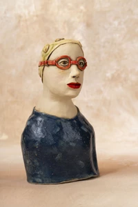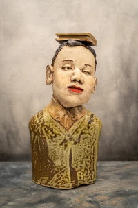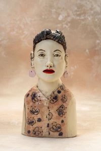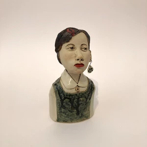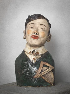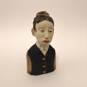 Nachiko's work is continually evolving, with people - historic and fictional - providing endless inspiration such as her 'character portrait' series. She spends many hours experimenting with glazes and sculpting techniques at her residential pottery studio. Current focus is wheel-thrown work and portrait pieces. All her creations are highly individual. Examples on display are recent examples of folk drawn from current events and folklore.