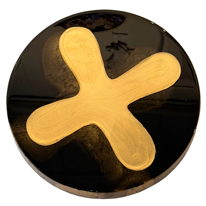 Gold leaf, inks and resin on board